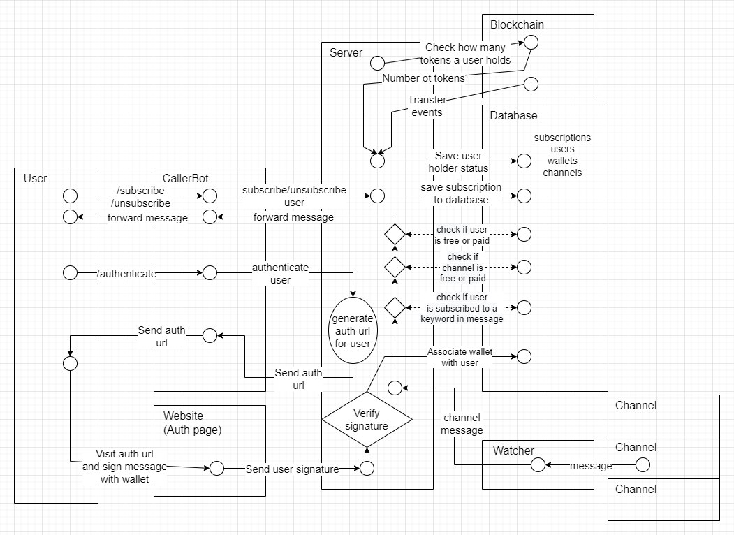 CallerBot is a telegram bot used to subscribe and unsubscribe to telegram messages containing a keyword. The AI is made out of two tiers. One can unlock Tier 2 by holding X tokens or the tier 1 version by holding Y tokens or being whitelisted. The bot watches 50 channels for the free version and 300 channels for the paid version. Once a message is sent to any of those channels, the bot will immediately go through all the subscriptions, and if the message sent contains the keyword for that subscription, it will forward the message to the user who subscribed (assuming the channel is free and the user is free, or the user is paid).